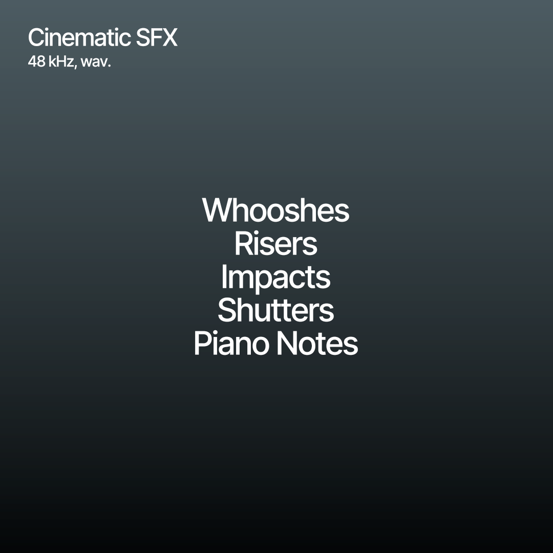 Enhance your edits with our Cinematic Sound Effects. A curated collection of clean, cinematic sounds designed for modern video workflows. From smooth whooshes and subtle impacts to atmospheric risers, each sound is crafted to blend naturally into your edit and support the visuals without overpowering them.